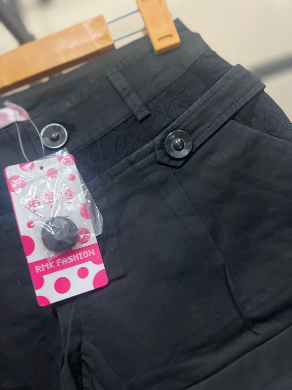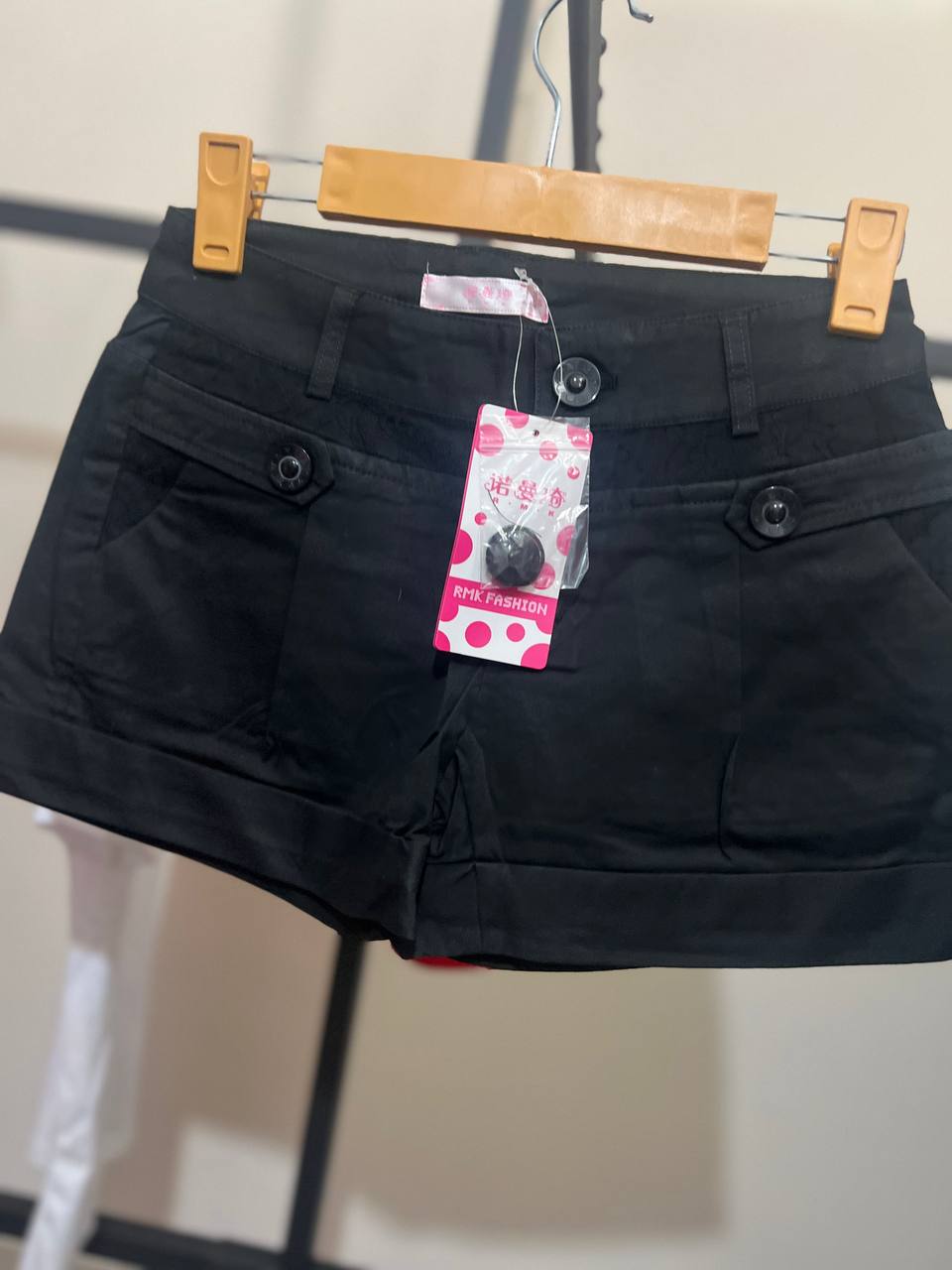 شلوارک کوتاه زنانه رنگ مشکی تزیین شده با دکمه و گیپور پاچه ها پاکتی و فاقد راحت دکمه اضافی
