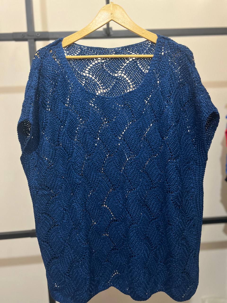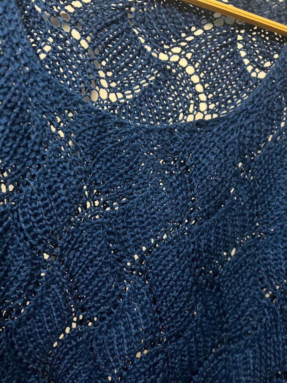 رنگ: آبی کاربنی / آبی نفتی (شیک و خاص) مدل یقه: یقه قایقی یا گرد باز آستین: کوتاه طرح بافت: طرحدار و موجی (بافت مشبک سراسری) لبه پایین: حالت موجدار و ظریف فرم: آزاد و راحت: سایز X.XL.M.S.L